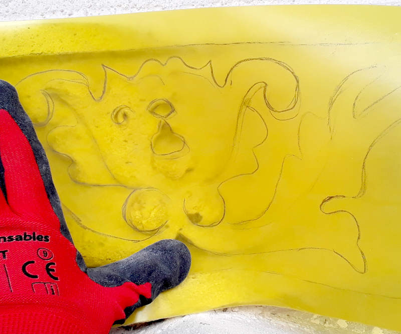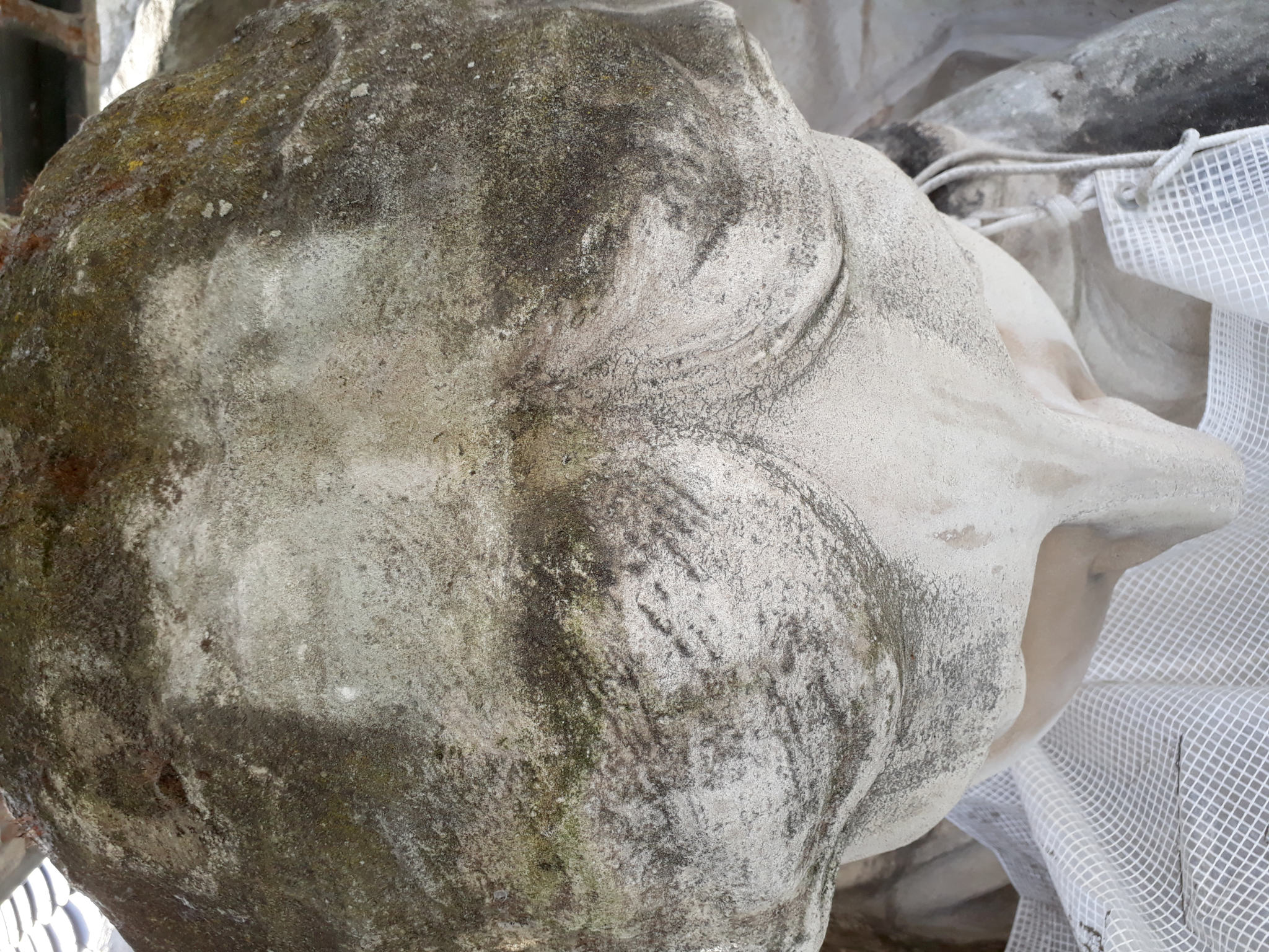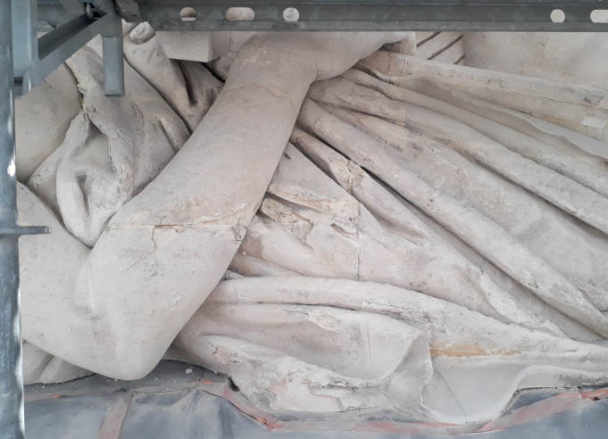Nettoyage de ragréages sur une figure féminine se trouvant couchée en bas à gauche du fronton de l’église de la Madeleine.