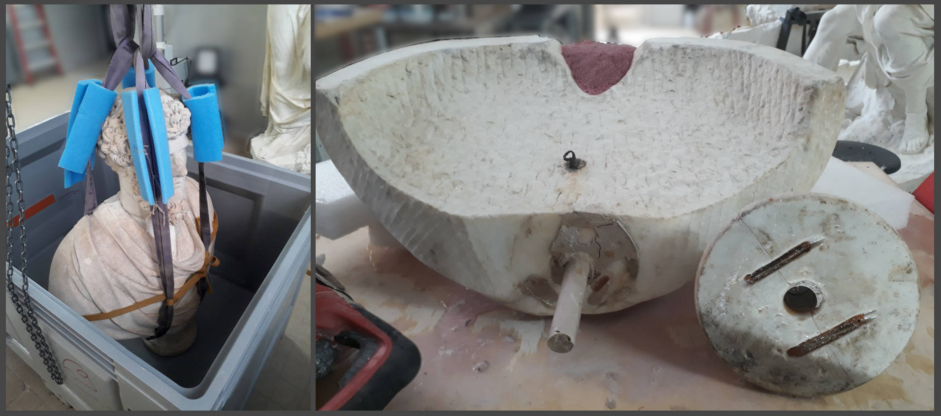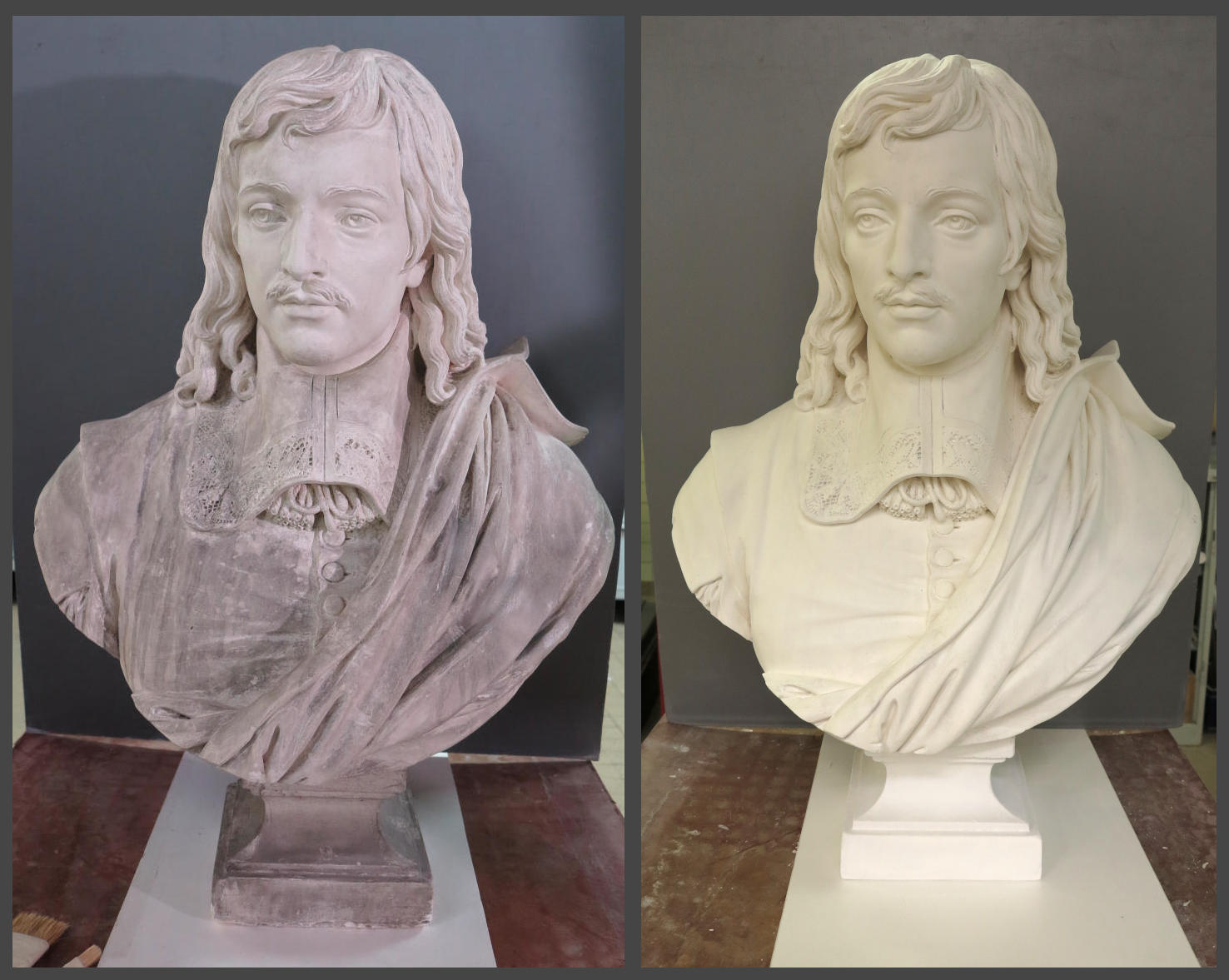 J'ai pu réaliser sous la direction de ma tutrice de stage Claudia RUBINO, restauratrice de sculpture, la restauration du buste en plâtre d'Eustache Lesueur (peintre) de Philippe Laurent-Roland, la restauration du buste Commode en marbre provenant de la cour de Marbre, le nettoyage des sculptures du Bain d'Apollon. J'ai aussi participé à divers petites interventions telles que des recollages de petits éléments, le nettoyage et le pochage de quatre sculptures qui devaient partir en prêt.